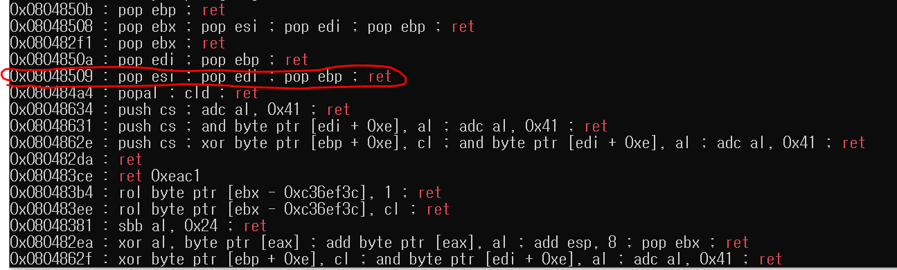 우선, read함수와 write 함수를 연속해서 사용하므로 pop-pop-pop-ret gadget이 필요하다.