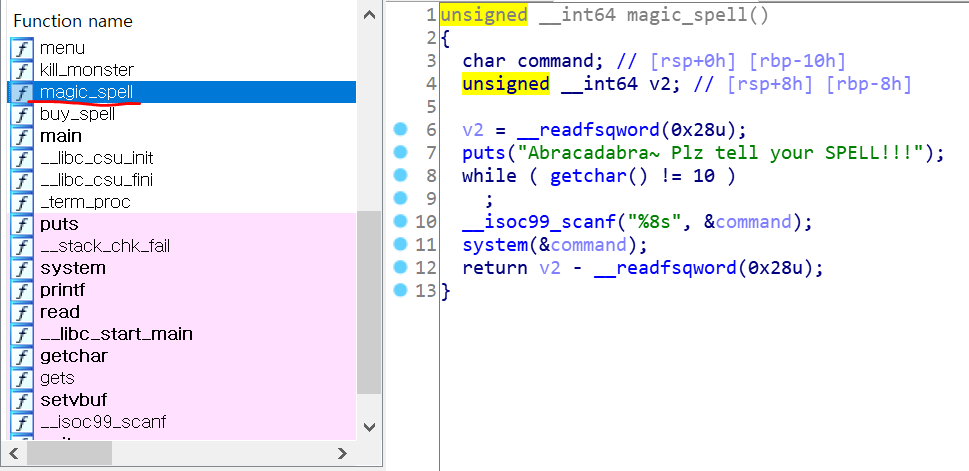 (magic_spell 주소: 0x40127B)