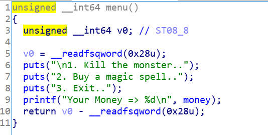 메뉴 2번 buy_spell 함수를 실행시켜 Canary를 변조시키지 않고 ret에 magic_spell 주소를 넣어주면