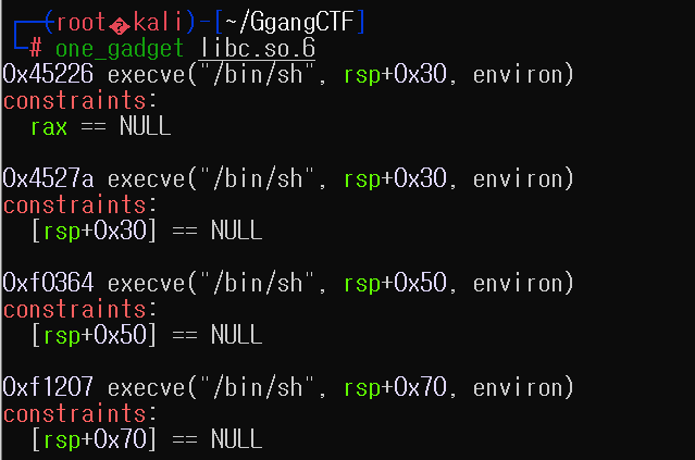 Excuse the ads! We need some help to keep our site up. List One-gadget(feat. PLT/GOT overwrite) One Gadget이란 해당 Gadget 하나만을 이용하여 Shell을 획들 할 수 있는 Gadget입니다.One Gadget은 라이브러리 파일 내에서 "/bin/sh"