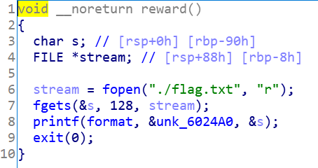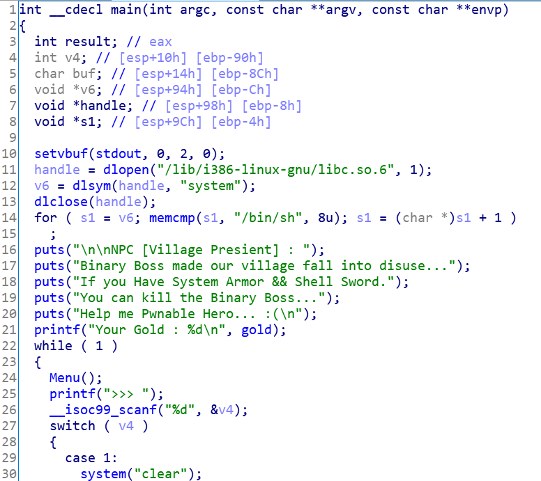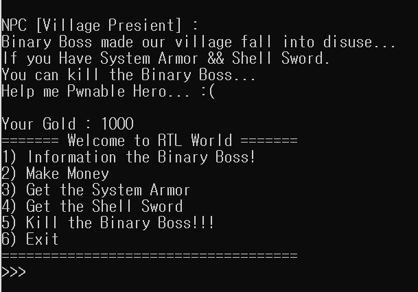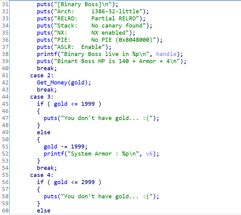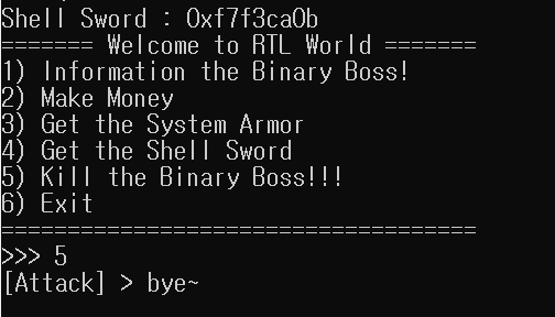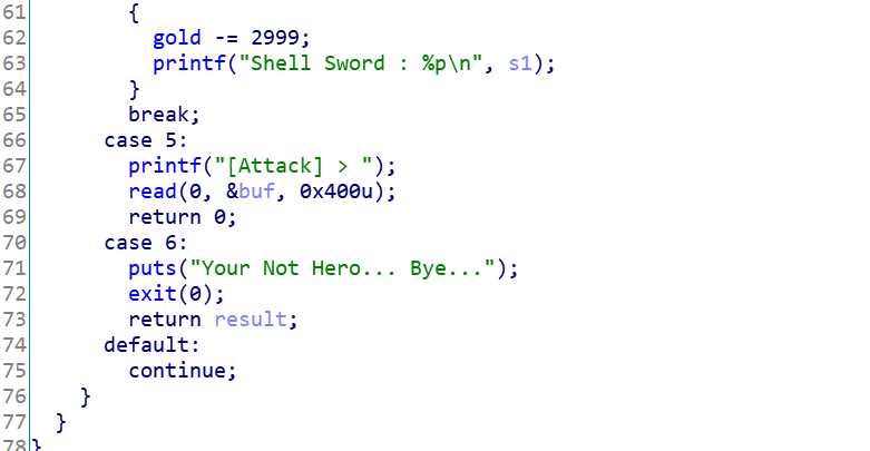 4를 선택한 경우, gold가 2999이하면 골드 없다고 출력하며, 초과인 경우 "/bin/sh" 주소 값인 s1(Shell Sword)을 출력한다.
