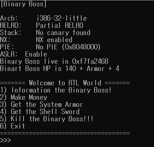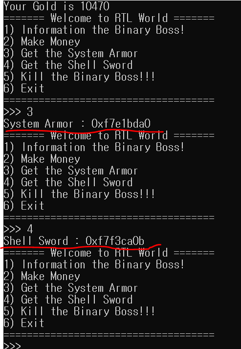 골드를 충분히 벌고 나서 3번 항목을 눌러서 System 함수 주소를 얻고, 4번 항목을 눌러서 "/bin/sh" 주소를 얻는다.