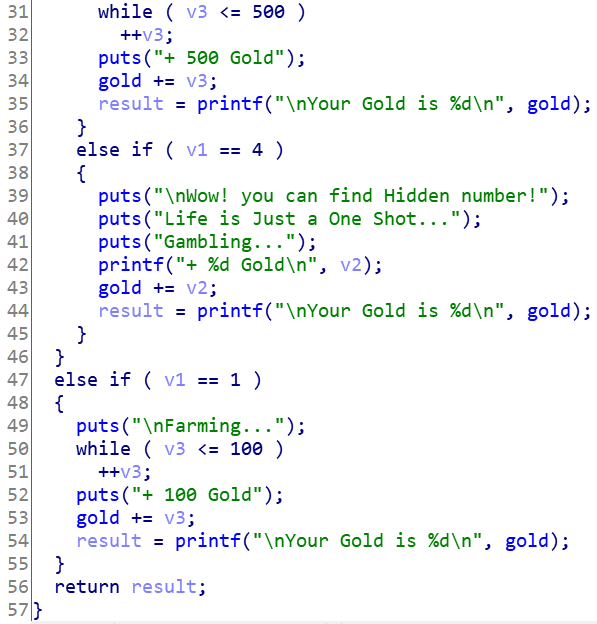 v1이 2보다 큰 경우에서 3인 경우, v3을 500이 될 때까지 ++v3 하고, 그 값을 gold에 더해주고 골드가 얼마 있는지 출력한다. 즉, 501 골드를 벌게 됨.