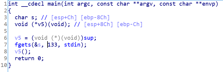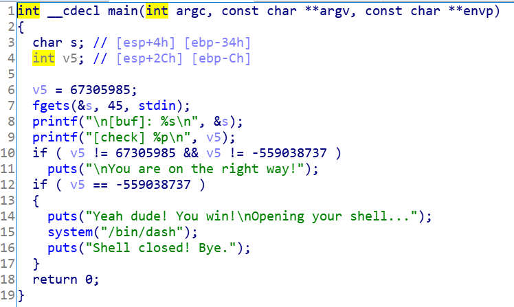 for문에서 s1는 v6의 주소를 대입 받아 memcmp로 s1과 "/bin/sh"를 8바이트 비교해서 다르면, s1을 1씩 증가시키는 것을 반복한다. 즉, s1이 "/bin/sh"를 가리킬 때까지 반복하고 끝난다.