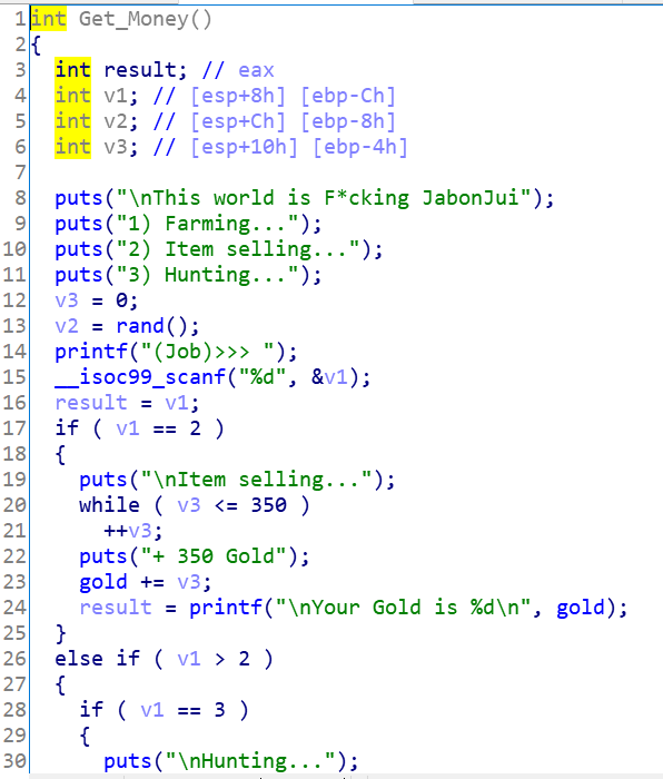 Get_money line 12~13: v3는 0으로 초기화하고, v2는 랜덤인 값을 대입해준다.
